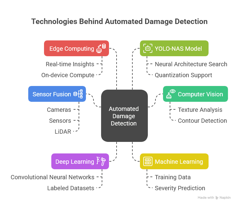 AI is not the only technology behind an automated damage detection system. It has computer vision, deep learning, sensor fusion, edge computing, and other data acquisition methods. These methods can be cameras, LiDAR, and laser scanners.