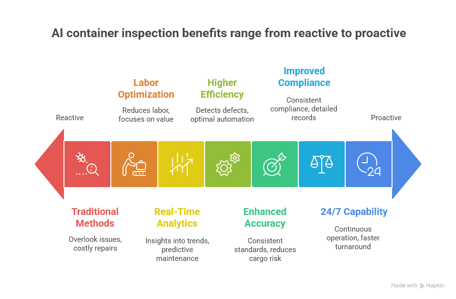 AI vision systems generate actionable insights about container condition trends, damage patterns, and maintenance requirements. The technology enables predictive maintenance scheduling, helping you identify recurring issues before they impact operations.